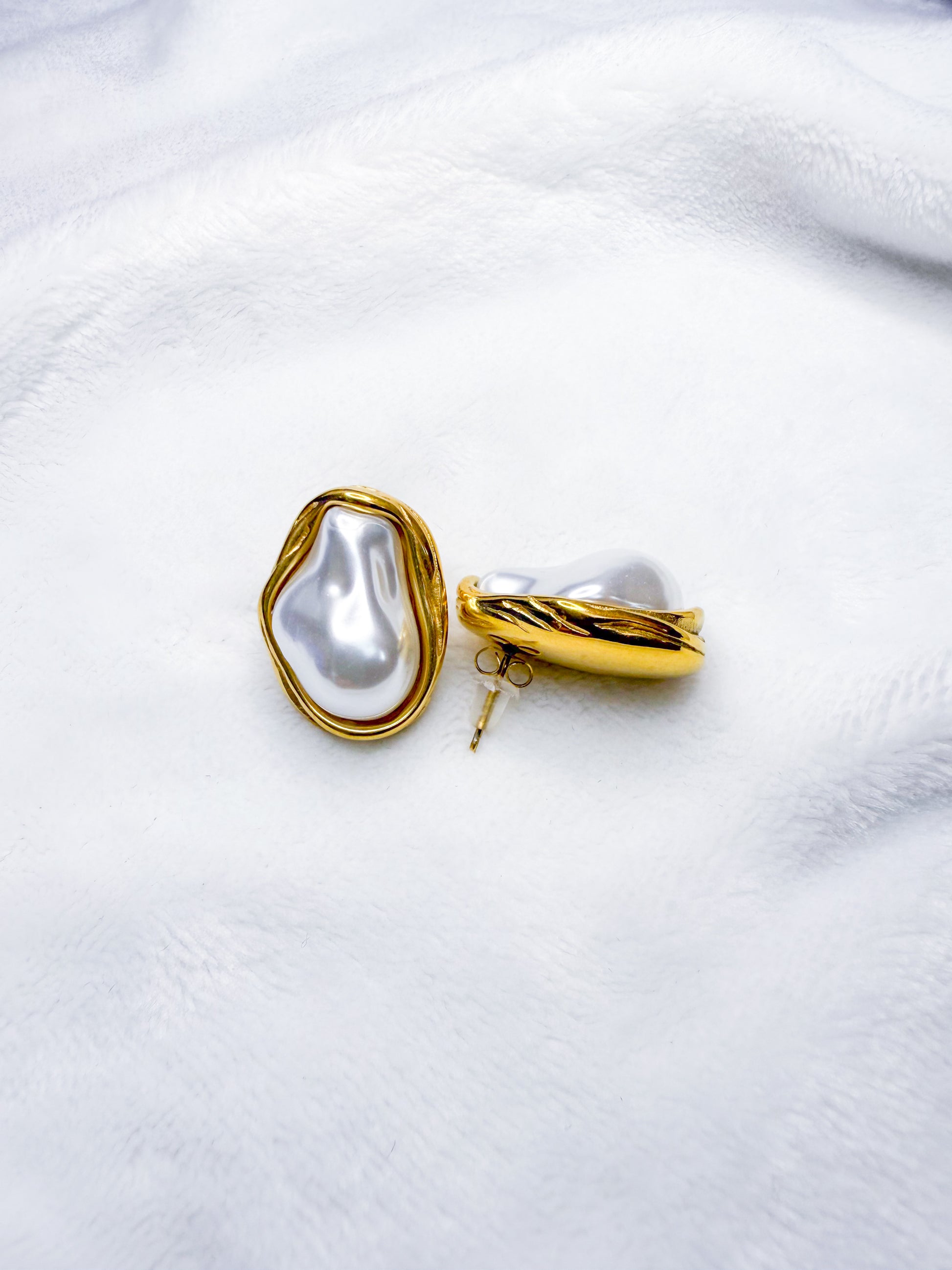 The Pearl Goddess Earrings feature a single, magnificent simulated pearl is cradled in rich, gold-plated stainless steel. These daring earrings embodies confident elegance, adding a touch of drama to any look.