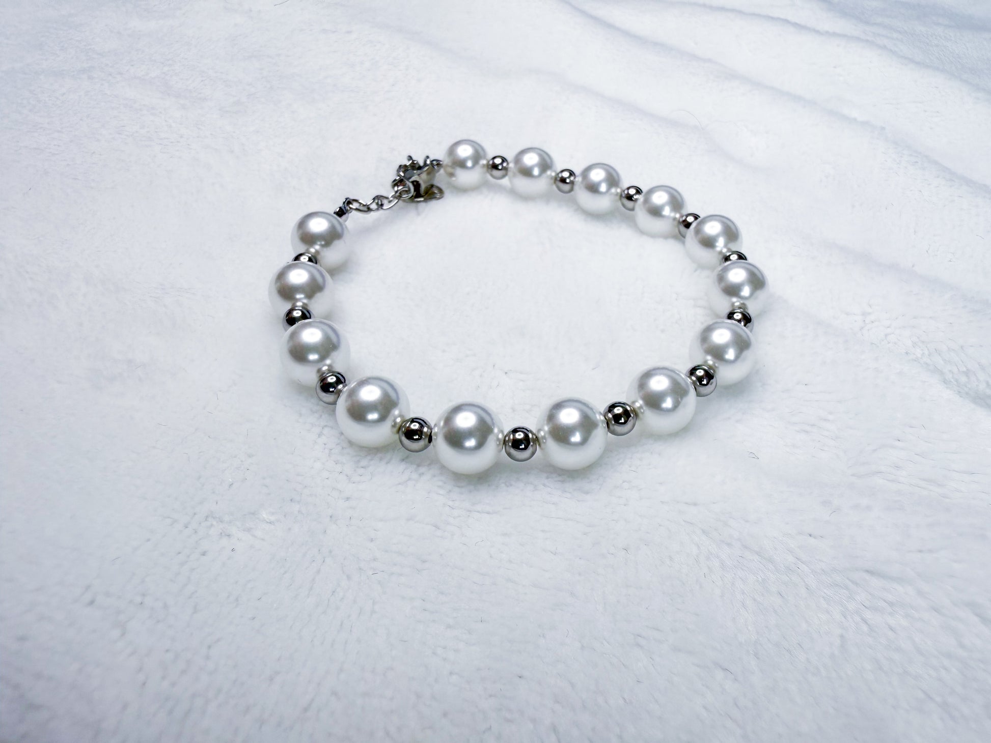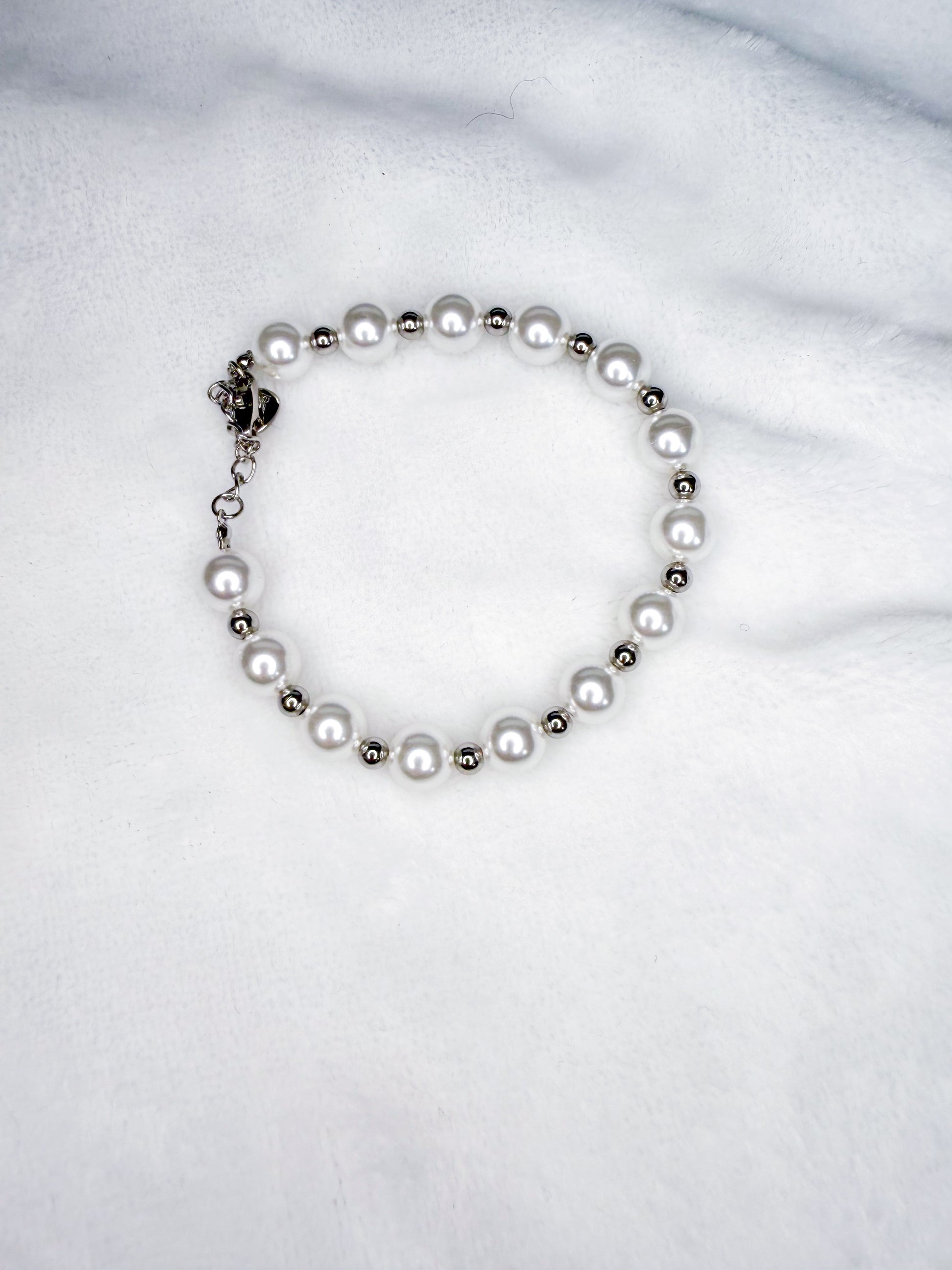 Embodying a perfect blend of classic style and modern elegance, this bracelet features a harmonious string of luminous, pearl-like beads, each one perfectly spaced by a delicate silver bead.